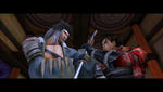 ここまで、かなり激しく斬り合う二人。