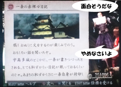 こちらの任務では姫たちの集うお茶会で日記がばらまかれることになり、「あれが読まれたら生きてはおれぬ、腹を切る!」とまで言っているノブに対してさすがに良心が痛むゴウさんは日記を取り返しに行くのでした、とのことです。